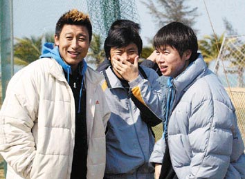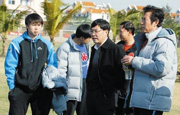 泰达俱乐部董事长谢德龙和主教练戚务生在体能测试现场(摄影:周勤隆)