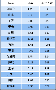 本轮为泰达球员打分中:得分最高为马拉(8.65分,1098人参与投票),得分最低为刘巍(3.61分,840人参与投票)。