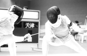 | 天津女子花剑队孙超(右)在比赛中 |