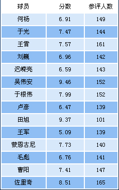 本轮为泰达球员打分中:得分最高为吴伟安(9.46分,152人参与投票),得分最低为王军(5.09分,139人参与投票)。