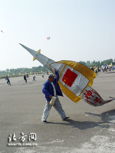 在上午立体类最大风筝的比赛中,天津东丽队李松年获得本次比赛产生的首枚金牌。陕西亨通光华制药有限公司代表队杨坤获得软体类最大风筝的冠军。