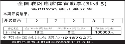 全国联网电脑体育彩票(排列5)06266期开奖公告