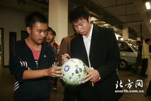 泰达1-1平中能 于根伟穿西装为球迷签字(组图)