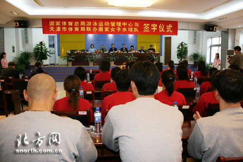 北方网消息(记者刘欣):8日下午,国家游泳运动管理中心与天津市体育局正式签署了共同组建中国女子水球队并落户天津的协议。双方将共同承担国家女子水球队备战2008年奥运会的任务,而与此相关的备战工作已经全面展开。