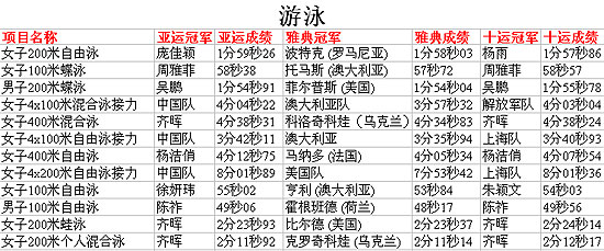 虽然在上届釜山亚运会上,中国水军完胜日本的战绩令人振奋,但是在随后的雅典奥运会上,中国泳将也仅由罗雪娟一人拼下一枚女子100米蛙泳的金牌。本届多哈亚运会,中国水军不仅让日本人缩小了与我们在亚洲泳池的差距(中日在奥运项目的金牌比为13:15,单论奥运项目,中国水军其实已经不敌日本),而且在夺得的16枚金牌里,在成绩上也鲜有佳绩。除了吴鹏在男子200米蝶泳上游进了1分55秒并创在今年全球第二好成绩之外,其他选手似乎并没有带给大家更多的激动。本届运会,中国派出数名年轻选手参加游泳比赛,这是非常必要的。但从亚运会的表现看,这些新人距离担当大任,都还有较大距离。特别是季丽萍和16岁的杨洁俏,以她们平时的成绩,只要正常发挥,在亚洲级别的比赛里应该说还是难觅对手,但是这两名选手却双双在决赛中发挥失常,使得金牌旁落。在北京奥运会上,中国游泳要冲击更好的成绩,除了年轻选手要更稳定的发挥,恐怕齐晖、罗雪娟等几名老队员的表现也至关重要。