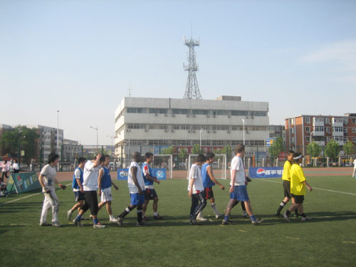 天津中医药大学赛区因为一支国际球队的加入而令人瞩目,这支球队由天津中医药大学留学生组成,七名队员分别来自德国、韩国和西非,他们给自己的球队命名为“国际老外”。只见他们身体强壮,技术娴熟,配合默契,俨然是赛区冠军的最大热门。同时他们也不负众望,一路过关斩将,闯进了最后的决赛。决赛在现场众多球迷的期待中开战,“国际老外”队先开球,球在“国际老外”队员的脚下经过一连串眼花缭乱的倒传后,由韩国留学生朴起范完成了第一次射门。而他们的对手No.1 Forever队的队员也展示出了他们的强劲实力——精湛的脚法、精妙的短传、精准的卡位、漂亮的过人、强力的射门。经过30分钟的激战,双方互交白卷,进入了残酷的点球大战。最终,No.1 Forever队的守门员发挥出色,神勇扑出“国际老外”队两个点球,帮助本队以4:2的比分胜出,拿到了天津城市决赛的入场券。