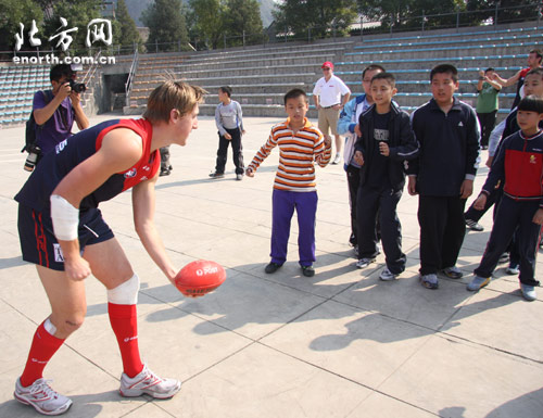 澳式足球虽然对于中国来说比较陌生,但是运动员们的精彩表演却引起了来到黄崖关长城游玩的孩子们的兴趣。今天恰巧是天津市河西区中心小学的孩子们到黄崖关长城秋游的日子,在看到澳式足球运动员们的精彩表演后,很多来自该小学的学生情不自禁地参与到表演中来,尽情享受澳式足球带给他们的乐趣。澳式足球的运动员们也耐心的给孩子们讲解澳式足球的技巧,帮助他们玩的更开心。