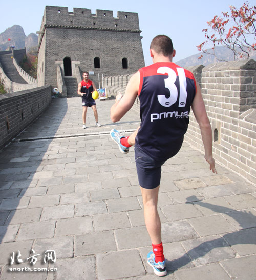 澳式足球是一种源自于澳大利亚维多利亚州墨尔本地区的球类运动,比赛在板球场或差不多大小的草地球场上进行,球场长度可达185米(200码)。这种比赛和其他球赛相较,最大的特色是速度快以及球的移动自由度大。因为长城上的空间有限,所以澳式足球运动员们只进行了简单的传接球表演和一些防守技巧的展示。但是运动员们都显得很兴奋,因为很多人是第一次来到长城,而在长城上进行澳式足球的表演更是前所未有的。来自天津师范大学澳式足球俱乐部的赵伟也应邀和墨尔本澳式足球俱乐部的队员们一起进行了表演,通过澳式足球展示了两个城市之间的友谊。