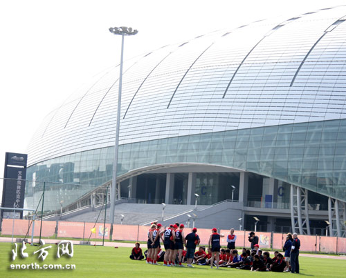 来到天津奥体中心后,墨尔本澳式足球代表团的成员们都被漂亮的天津奥体所吸引,称赞这里是世界上最漂亮的体育场。按照计划,天津师范大学和天津电子信息职业技术学院的两支澳式足球队18日中午将在天津奥体中心体育场足球训练场进行一场表演赛,墨尔本澳式足球俱乐部代表团成员将在现场观看比赛并同队员进行技术交流。但是当两所高校的同学们都到来后,墨尔本澳式足球俱乐部的球员们并没有只是观看,而是很快与同学们打成一片,一起进行训练。墨尔本是澳式足球的发源地,而在我国这项运动才刚刚兴起,因此来自天津师范大学和天津电子信息职业技术学院的同学们在水平上与澳大利亚的球员存在着很大的差距,交流逐渐变成了单方面的指导。