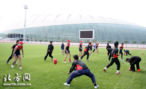 北方网消息(记者谢力强):来天津进行友好访问的澳大利亚墨尔本澳式足球代表团10月18日中午来到了天津奥林匹克体育中心足球训练场,在这里与来自天津两所高校的澳式足球俱乐部的同学们共同进行了训练和比赛。