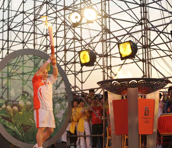 北京奥运圣火在福建首站福州的传递已经圆满结束,2004年雅典奥运会男子举重62公斤级冠军石智勇已在终点望龙台公园点燃了圣火盆,现场的气氛达到了最高潮。