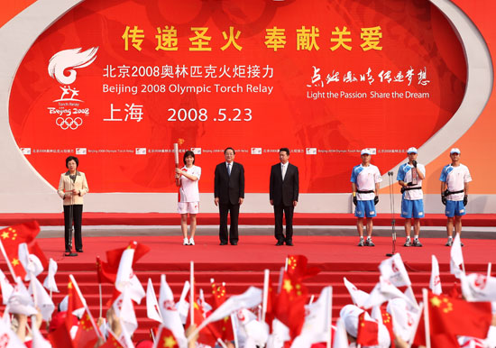 5月23日上午8时,北京奥运会圣火开始在上海传递。在火炬传递起跑仪式举行前,所有现场人员都向在四川地震灾害中遇难的同胞默哀一分钟。