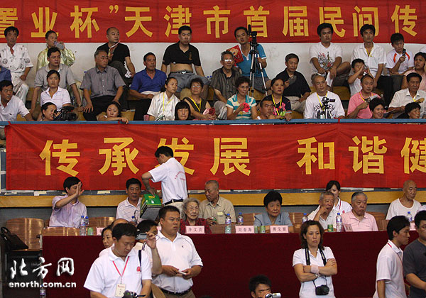 这次比赛不仅是一次比武较艺,更是天津武术界各门各派一次交流切磋、以武会友的良机。很多武术界的老前辈都来到现场为武林后辈加油鼓劲,对他们进行指点。80高龄的武林泰斗、曾经为邓颖超表演武术的李文珍对记者表示,有这么多人喜爱中国传统武术,一定可以把武术发扬光大。
