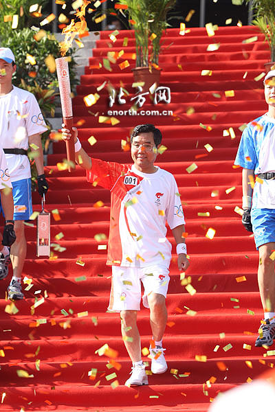 北方网消息(记者谢力强):全国道德模范、国家建筑工程质量最高奖“鲁班奖”获得者、天津市建工集团控股有限公司项目经理范玉恕成为今天的首名火炬手,在天津奥林匹克中心体育馆前广场,他高举祥云火炬,领跑天津站中心城区火炬接力。