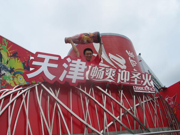 2008年北京奥运火炬天津市内传递日当天,在城市庆典现场的可口可乐展区内,一个高2米的可口可乐艺术瓶非常引人注目。这个2米高的艺术瓶上描绘得天津小吃栩栩如生。它的设计者就是在可口可乐公司组织的“锦绣中华瓶我秀——弧形瓶设计大赛”天津赛区中胜出的冠军赵鑫。近日,赵鑫将带着他的作品赶赴北京,参加在北京朝阳公园和世贸天阶举办的可口可乐畅爽地带活动,并现场为他的个性作品作讲解,同时与来自全国34个省市的艺术瓶获奖冠军们交流设计理念。