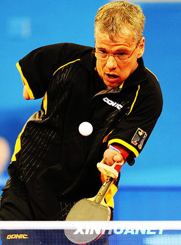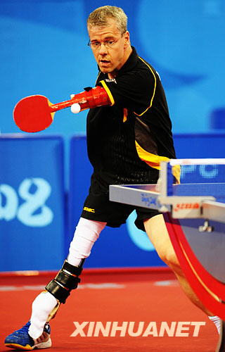 9月11日,德国选手赖纳·施密特在比赛中。当日,在北京2008年残奥会乒乓球男子单打M6铜牌决赛中,43岁的残奥会“七朝元老”赖纳·施密特以1比3负于荷兰选手尼科·布洛克,无缘奖牌。