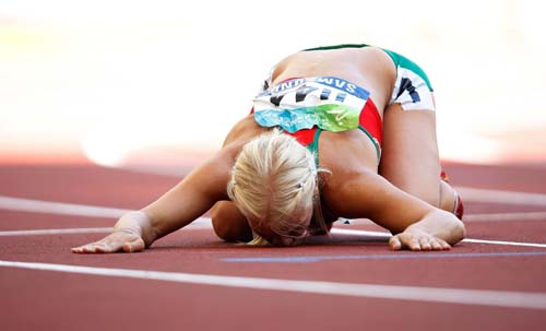 北京时间9月12日,在国家体育场进行的北京2008年残奥会女子200米T38级首轮比赛中,基鲁先卡以30秒79的成绩晋级决赛。图为比赛结束后,基鲁先卡跪谢苍天。