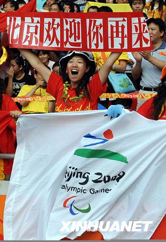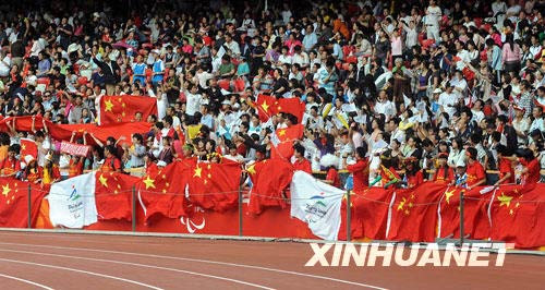 当日,是北京2008年残奥会比赛的最后一天,国家体育场成了红色的海洋,观众们在看台上挥舞五星红旗,为运动员加油助威,场面热烈、壮观。