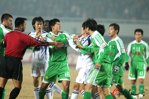 本场比赛的裁判吹响终场结束哨的时候,天津队教练席很多人冲入场内表示不满,而国安的教练席也随即冲入场地。此时更为震惊的一幕发生。谭望嵩和郭辉两个人先后推搡对方,在双方工作人员和球员赶来劝阻之后依然扭打在一起。等待双方扭打在一起的球员被拉开之后,国安队已经被换下场的杜文辉也被天津队中的一名工作人员伸手打了一拳。此拳正中杜文辉的眉骨。
