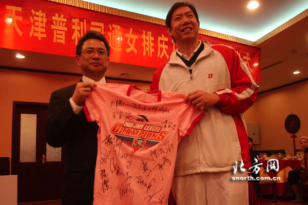 今天的活动是以庆祝天津普利司通女排获得08/09赛季全国女排联赛冠军而开的庆祝会。天津市体育局、天津普利司通轮胎公司的相关领导出席了本次活动。在活动中,天津女排与普利司通互赠礼物,并且签下了续约三年的合约。