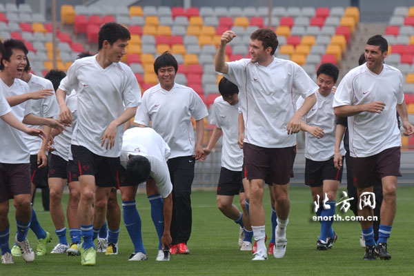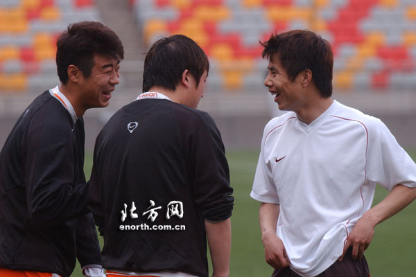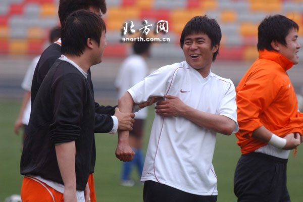今天下午,两队在泰达足球场分别进行了踩场训练。泰达队的训练在下午4:30开始,但是球员们却集体“迟到”了,除了几名外援准时到达以外,其他球员都迟到了十几分钟,训练也推迟到了将近5点才开始。但是,队员们在训练中表现出的状态却与“迟到”的他们截然相反,在分组对抗中大家都表现出了十分积极的态度,攻守都十分精彩,韩燕鸣、姜晨、毛彪都有进球入账。对抗赛打得酣畅淋漓,以至于训练直至将近六点山东队进场了才宣告结束。