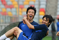 泰达公开训练备战国安 陈涛抱起吴伟安