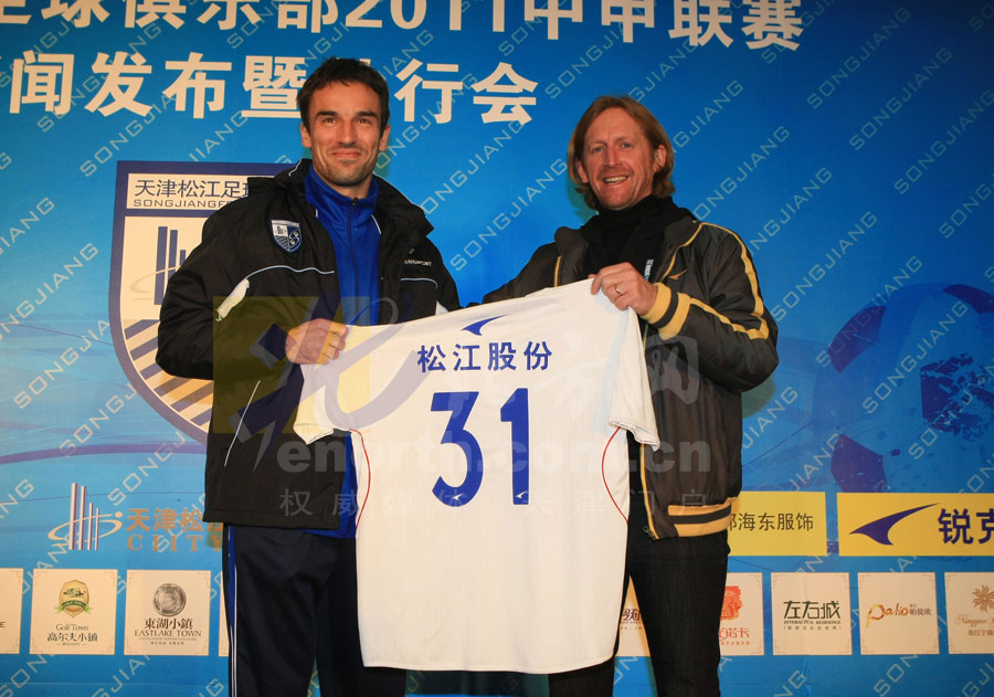 2011年3月21日下午3点,天津松江队在天津奥体中心举行了新赛季的壮行会,主教练德维尔德为新队员披上了战袍,并且代表球队吹响了松江队征战2011赛季中甲联赛的号角(摄影:刘欣)……