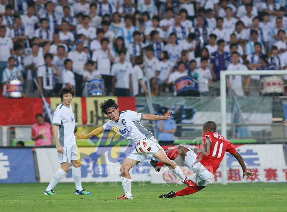 2011年6月12日19:30,泰达主场迎战恒大,最终0:1落败。本场比赛双方球员都发挥了自己的水平,球场上的拼抢十分激烈,而场下李章洙一次一次质疑裁判的判罚,同样吸引了球迷的目光(摄影马成)。