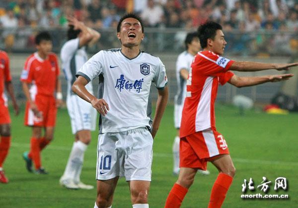 北京时间7月2日19点30分,中超联赛第14轮在泰达大球场展开争夺,由天津泰达在主场迎战青岛中能。图为王新欣仰天长叹。