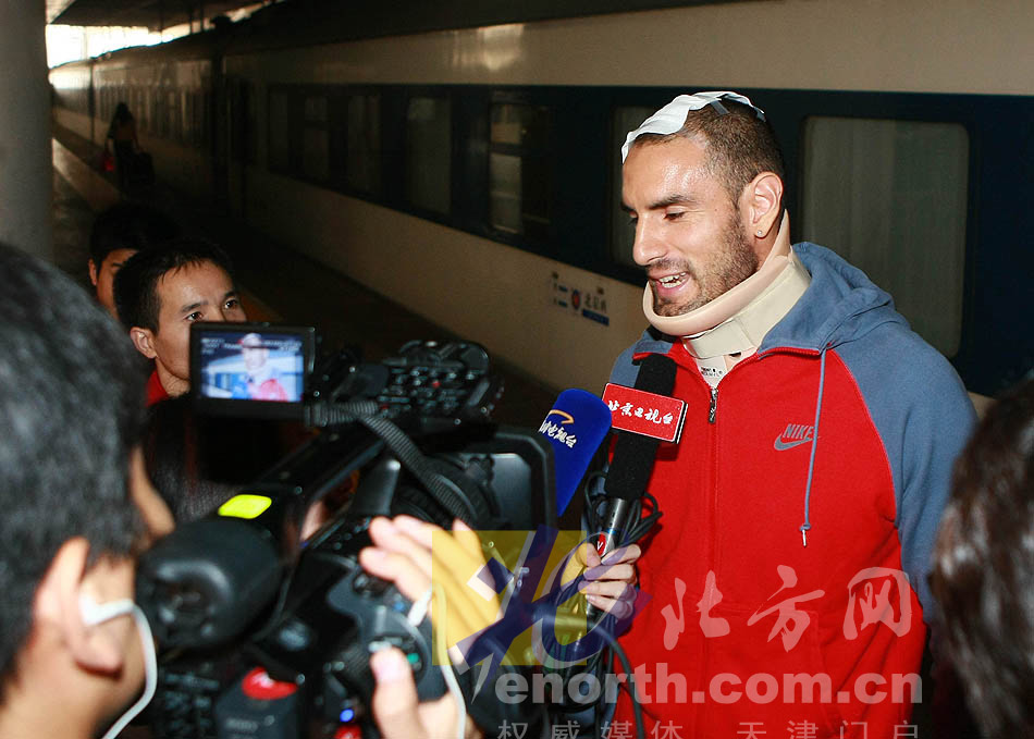 北京时间10月11日,在与广州恒大队的比赛中严重受伤并接受手术治疗17天后,天津泰达队外援卢西亚诺乘坐的T16次列车准时于13:25顺利抵达北京西站。(摄影 刘欣)……