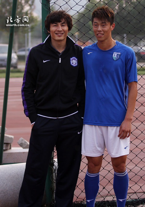李玮锋在观看松江队训练的间隙,不时有球迷找其索要签名,除了球迷喜欢追星以外,同为津门铁卫的松江队主力后卫于睿也丝毫没有掩饰对自己前辈的喜爱,不过平时场上生龙活虎的小伙子见到自己的偶像时还的确腼腆了一回。尽管身为同行却难得有机会见面相识,终于在主教练郝海涛的引荐和“怂恿”下,于睿也终于有机会和自己的偶像李玮锋亲切的会面并合影留念。