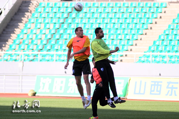 :北京时间5月25日,天津松江足球队在呼和浩特市体育场进行了赛前踩场训练,备战中甲联赛第11轮与呼和浩特东进队的比赛。图为,松江外援安德森与大卫兰争顶。