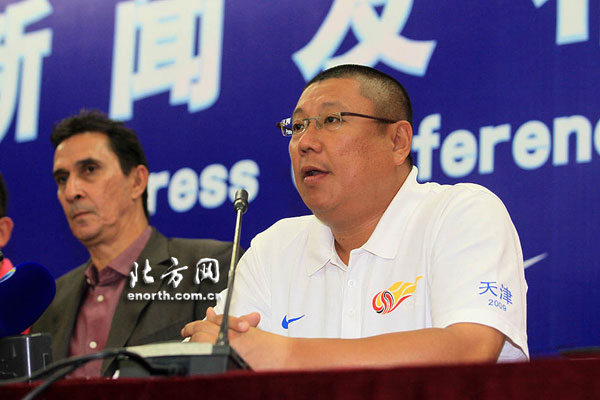 6月1日下午,天津泰达队在水滴体育场召开了新闻发布会,宣布新任主教练吉马良斯的上任。泰达俱乐部的总经理李广益和新任主教练吉马良斯以及教练组的成员出席了新闻发布会。图为泰达总经理李广益发表讲话。(摄影 刘欣)