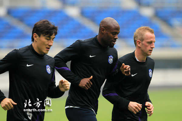 天津北方网讯:6月1日下午,天津泰达队在水滴内场进行了公开训练,带队训练的是刚刚开完新闻发布会的新任主帅吉马良斯。下午4点,泰达俱乐部为吉马良斯在水滴俱乐部召开了新闻发布会,发布会结束后,吉马良斯与就在泰达俱乐部总经理李广益的陪同下与全体队员见了面。