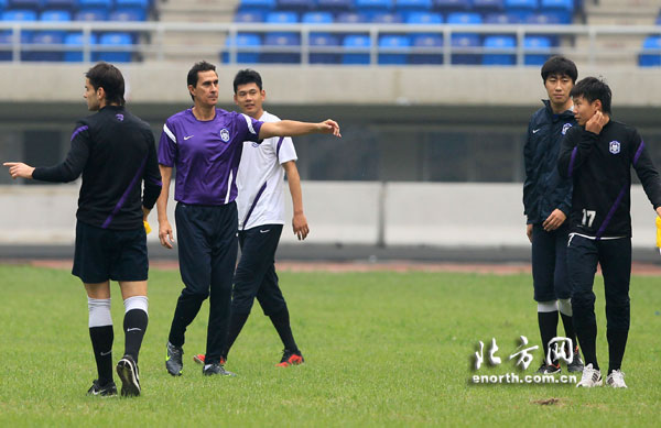 虽然与队员刚刚见面,但是吉马良斯还是很快投入到了工作之中。在他带队的首堂训练课上,主要进行了体能的恢复,而在训练的前半阶段,吉马良斯只是让队员们跑圈,而他则分别与泰达队的几名教练进行沟通。