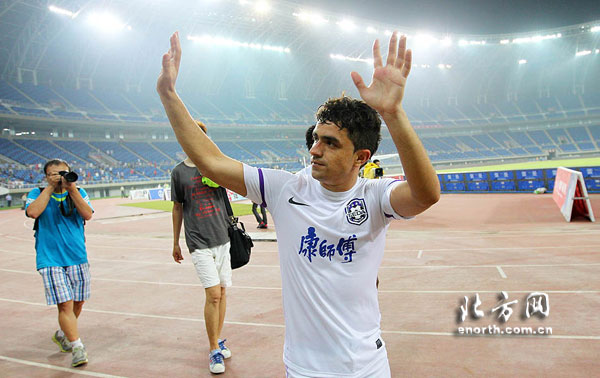 天津北方网讯:7月23日,天津泰达队继续在师大体育场进行公开训练。训练开始前,已经接到俱乐部解约通知的迪尼尔森和一起奋战了半个多赛季的队友一一拥抱告别。虽然这名小个子球员在最近几轮比赛中展现出了不俗的实力,但是已经下定决心引进更强外援的天津泰达俱乐部还是选择放弃了他。