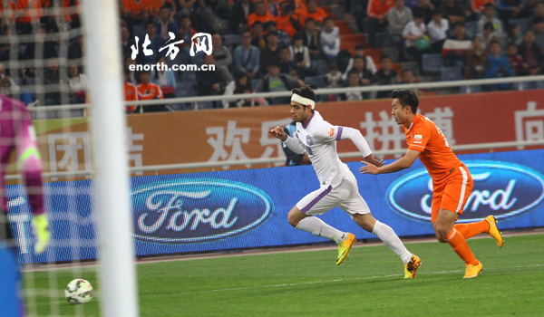 北京时间2015年4月17日19:35,2015赛季中超联赛第6轮,天津泰达客场挑战山东鲁能,图为比赛精彩瞬间。