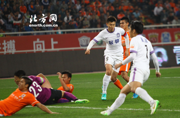 北京时间2015年4月17日19:35,2015赛季中超联赛第6轮,天津泰达客场挑战山东鲁能,图为比赛精彩瞬间。