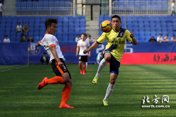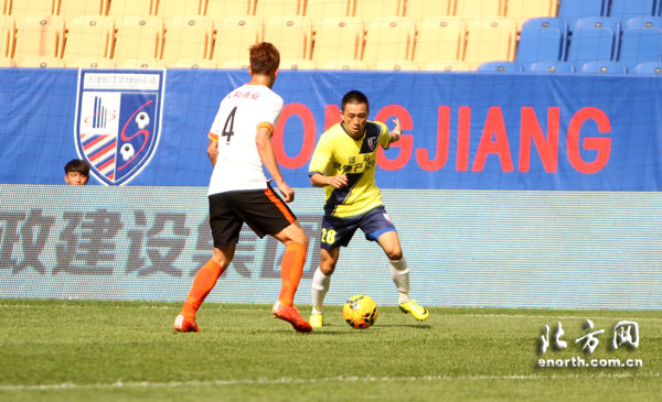 双方的上半场争夺,两队从比赛一开始便展开对攻,人和队阵型压上进攻,松江队整体防线后撤的同时伺机展开反扑。比赛第21分钟,人和队外援埃里克森禁区内接队友直塞形成单刀,松江队门将时萌奋勇出击将皮球扑在身下。第23分钟,松江队后场大范围转移,苏缘杰禁区内接队友直传球抢点摆脱后射门,皮球偏出。第27分钟,人和队冯仁亮禁区前沿射门高出。1分钟过后,松江队快速反击,杨万顺突入禁区后拿球被破坏。第34分钟,人和队外援尤里禁区得球转身抽射,时萌飞身堵截将球击出,尤里跟上一脚踩到时萌腿部并因此吃到黄牌。第37分钟,人和队埃里克森犯规,松江队获得前场任意球机会,吴伟超头球一蹭制造威胁。第40分钟,人和队横向传递寻找机会,向汉天右路射门偏出。第43分钟,松江队反击机会,杨万顺门前得球急停过人后抽射,皮球偏出立柱。上半时比赛战罢,津黔两队双方均无建树。