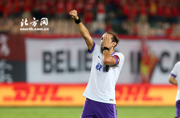 北京时间2015年6月4日20:00,2015赛季中超联赛第13轮,天津泰达客场挑战广州恒大,图为比赛精彩瞬间。