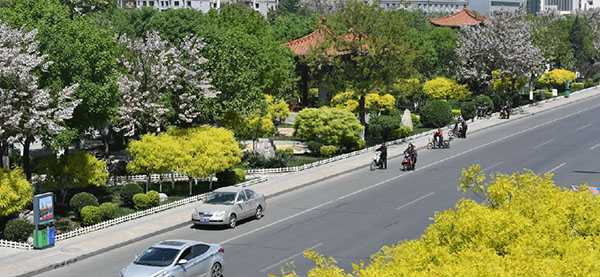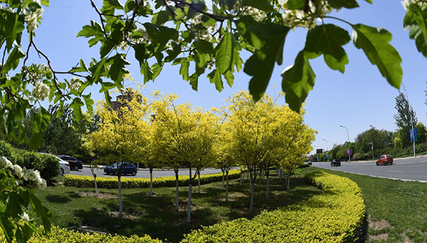 第一个“点位”自然是本届马拉松赛的起始点(也是终点)——雍阳西道。此时赛事的工作人员正在搭建“舞台”,旁边的雍阳西道上交通秩序井然。而赛事起终点的南侧就是天津市五星级生态型公园——武清区文化公园。说起武清区文化公园,就不得不提到那个著名的红色圆球造型的建筑,这个造型新颖的红色的大圆球在公园内显得格外醒目,此时阳光照了进来,一位父亲正在圆球内哄着女儿嬉戏打闹着。沿着雍阳西道向西大约1公里,左拐进入翠亨路。翠亨路是武清城区的主干道之一,是一条景观大道。这条路北起京津高速武清城区北口,南到京津城际武清站,全长10公里。翠亨路果然是美景如画,满眼都是郁郁葱葱,那醉人的绿色扑面而来,一时望不到边际。车速放慢,原来在这丛丛绿意中还有一朵朵的小花冲着你张开了笑脸,或是深红、或是浅白,她们在蓝天绿地的掩映下显得格外娇羞可爱。 4月的武清,果然春意盎然……