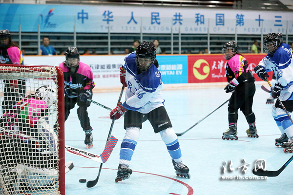 女子比赛共分为A、B、C三个小组,每个小组三支队伍。首日的焦点之战是B组东道主天津队迎战上海队。由于轮滑冰球是一个新项目,双方队员此前并没有太多的比赛经验,双方开场便频繁进行试探性进攻,攻防节奏很快。天津队在首节比赛中断球突破,由13号选手先拔头筹,比分改写为1:0。