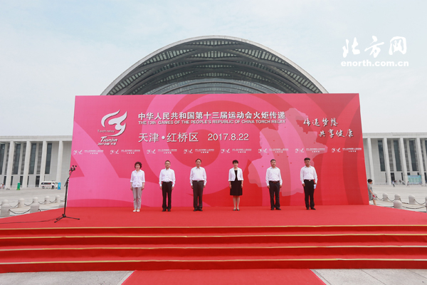天津北方网讯:8月22日上午9:00,中华人民共和国第十三届运动会火炬传递仪式第十三站在红桥区进行。随着红桥区第一棒火炬手杨树伟接过火炬从西站前广场出发,第十三届全运会火炬传递仪式红桥站正式开始。