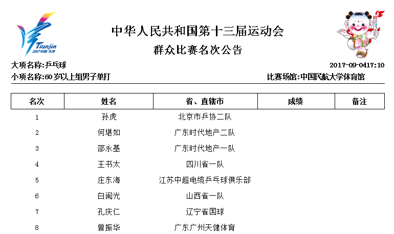 第十三届全运会群众比赛乒乓球60岁以上组男子单打名次公告