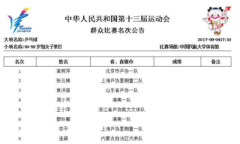 第十三届全运会群众比赛乒乓球50-59岁组女子单打名次公告