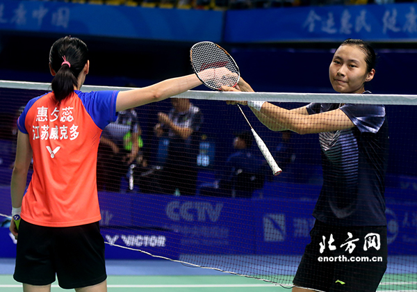 天津北方网讯:9月5日,第十三届全运会羽毛球女子单打比赛在天津市宝坻体育馆进行,在晚上进行的女子16进8的比赛中,上海名将王仪涵经过三局苦战以2-1(18-21/21-17/21-16)淘汰江苏选手惠夕蕊晋级下一轮。