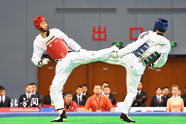 天津北方网讯:2017年9月5日,第十三届全运会跆拳道项目在天津商业大学体育馆继续进行。在男子68公斤级决赛中,来自江苏的赵帅为江苏代表团收获一枚金牌,这枚金牌也让他捍卫了自己旗手的荣誉。