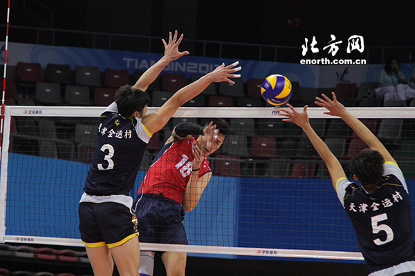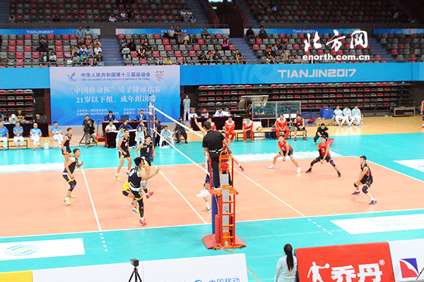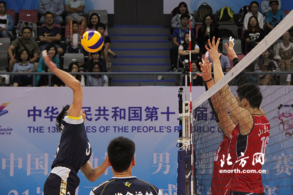 天津北方网讯:9月5日,全运会男子排球成年组1/4决赛在天津城建大学举行。东道主天津队不敌山东队,无缘4强。