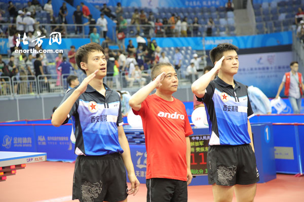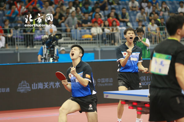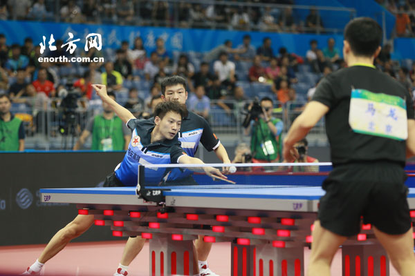 天津北方网讯:9月5日,第十三届全运会乒乓球男子双打项目决赛在天津武清体育馆结束。这场焦点之战在马龙/许昕与樊振东/周雨间展开。鏖战七局后,樊振东/周雨以4:3的比分战胜对手,摘得男子双打金牌。蝉联全运会男双冠军。