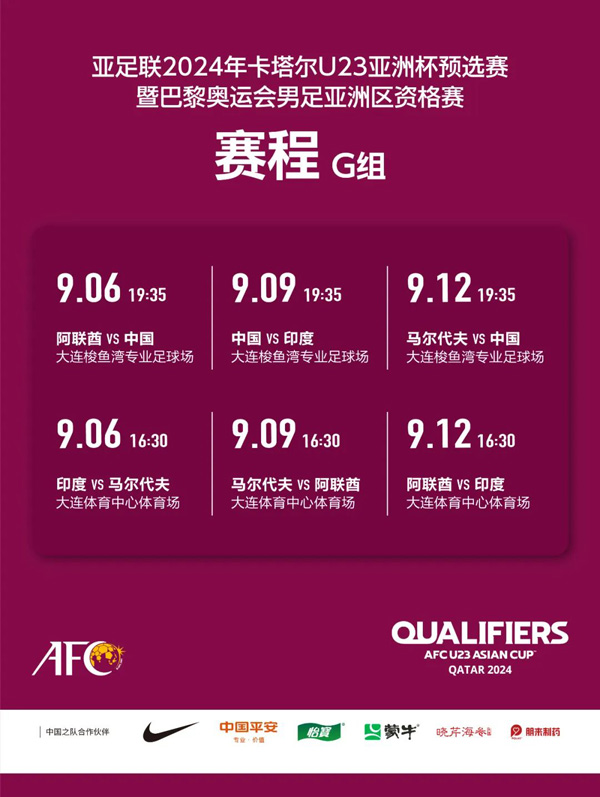 同时,亚足联也公布了2024年卡塔尔U23亚洲杯预选赛暨巴黎奥运会男足亚洲区资格赛G组赛程。G组比赛将由中国承办,并于9月6日至12日在大连举行。中国队、阿联酋队、印度队和马尔代夫队4队将展开总共6场比赛的争夺。